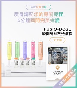 FUSIO-DOSE 瞬間髮絲改造療程,提供25種組合搭配,針對個人需要度身訂製,快速深層修護,效果即時可見。法式奢華浴髮護理,深度滋養頭皮及髮絲,即時見證秀髮柔順蛻變。網店輕鬆購買服務,到店享受髮廊護理。創藝 Creation Salon,香港新界天水圍天恩路12-18號置富嘉湖1樓147A&147B號鋪,預約電話: +852 2448 1178。