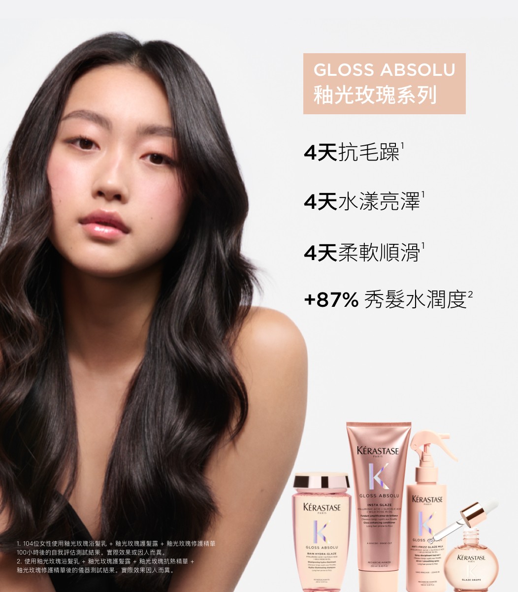 *104位女性使用釉光玫瑰浴髮乳 + 釉光玫瑰護髮露 + 釉光玫瑰修護精華100小時後的自我評估測試結果。實際效果或因人而異。
