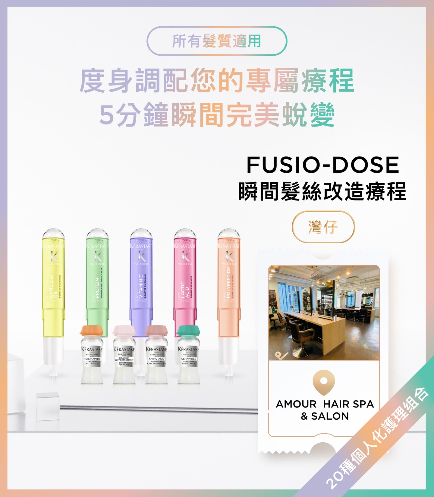 FUSIO-DOSE 瞬間髮絲改造療程,提供25種組合搭配,針對個人需要度身訂製,快速深層修護,效果即時可見。法式奢華浴髮護理,深度滋養頭皮及髮絲,即時見證秀髮柔順蛻變。網店輕鬆購買服務,到店享受髮廊護理。AMOUR HAIR SPA & SALON,香港灣仔皇后大道東202號QRE PLAZA 20樓,預約電話: +852 2868 3100。
